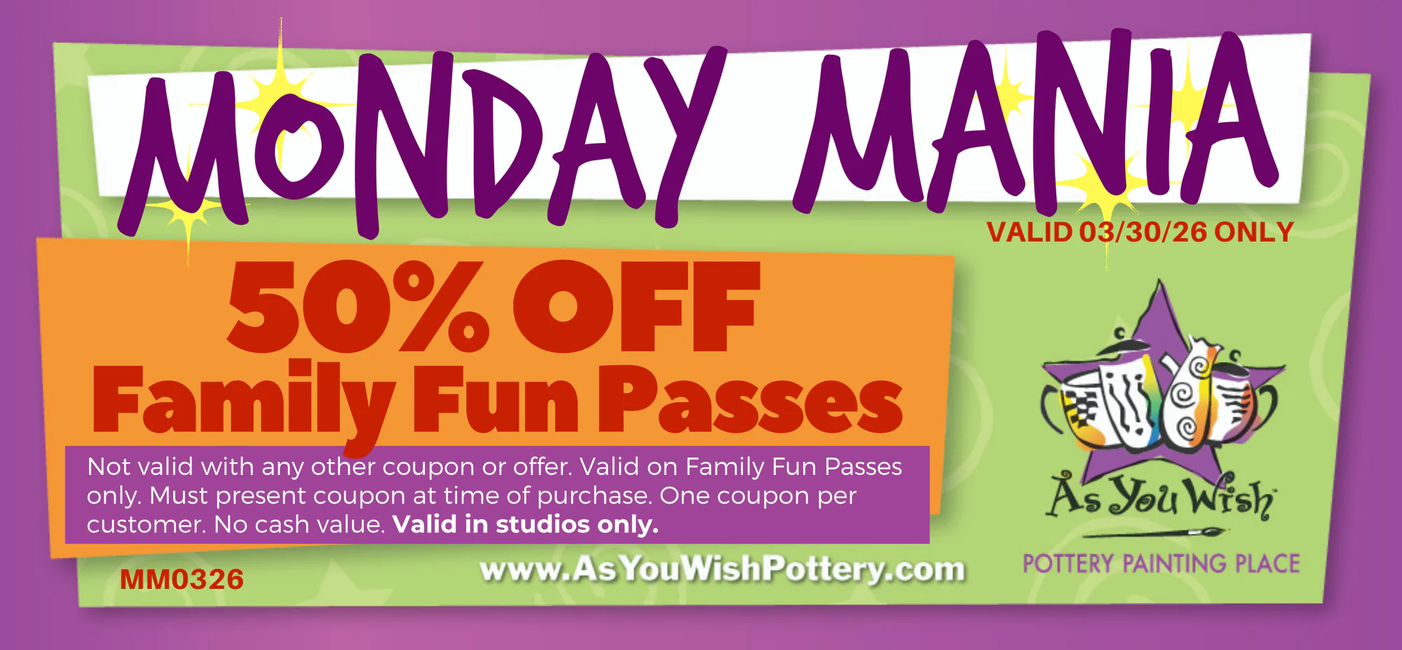 To get your coupon, visit at asyouwishpottery.com.